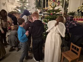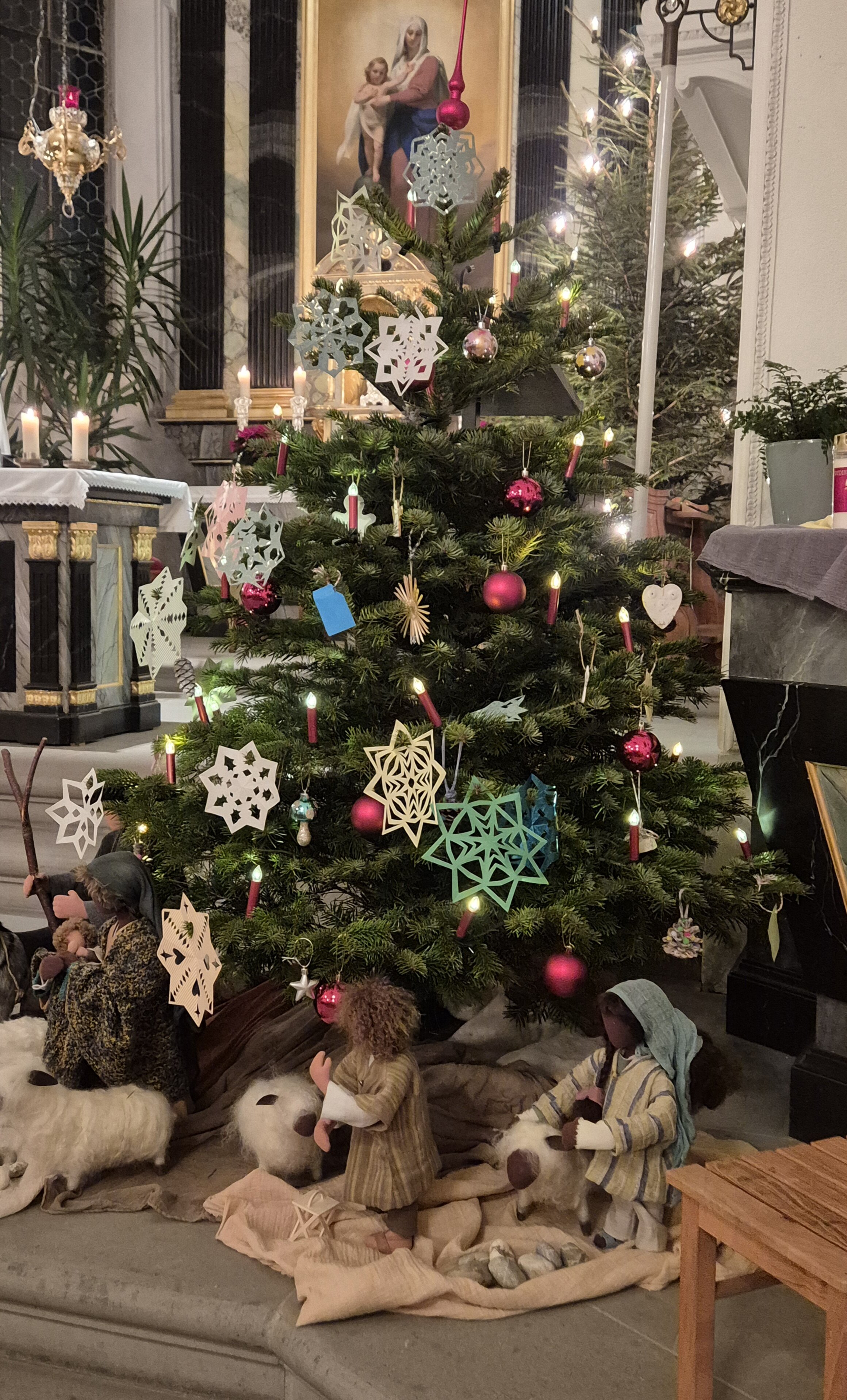 Ein besonderes Highlight war der Weihnachtsstern, der mithilfe von Romi und Markus durch die ganze Kirche wanderte. Passend dazu folgten zwei Besucherinnen dem Stern bis zur Krippe, was für eine sehr stimmungsvolle Atmosphäre sorgte. Mit grosser Freude hängten die Kinder ihre gebastelten Sterne an den Weihnachtsbaum – eine lieb gewordene Tradition der Familienandacht.