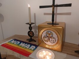 Dazu legte er weitere regenbogenfarbige Friedensfahnen vor den Altar.