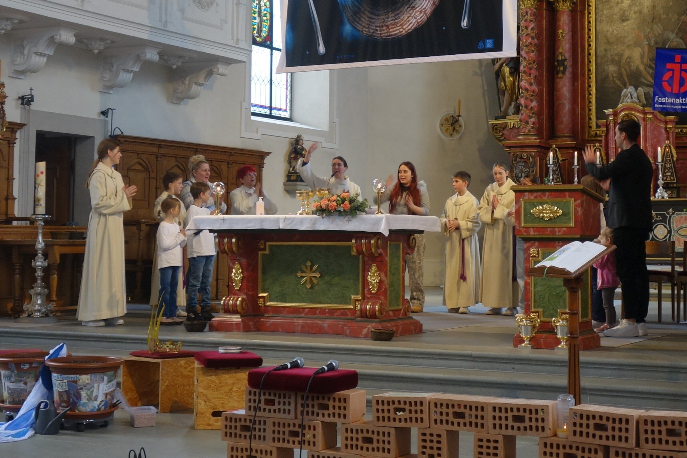 Im Zentrum stand das Wunder des Wachstums: So wie aus einem kleinen Samenkorn mit Regen und Sonne etwas Grossartiges entsteht, wachsen auch wir Menschen stetig. Die Kinder halfen aktiv dabei, die Geschichte des Samenkorns zu erzählen, und stellten sich die wichtige Frage der Fastenzeit: „Wohin wachsen wir?“